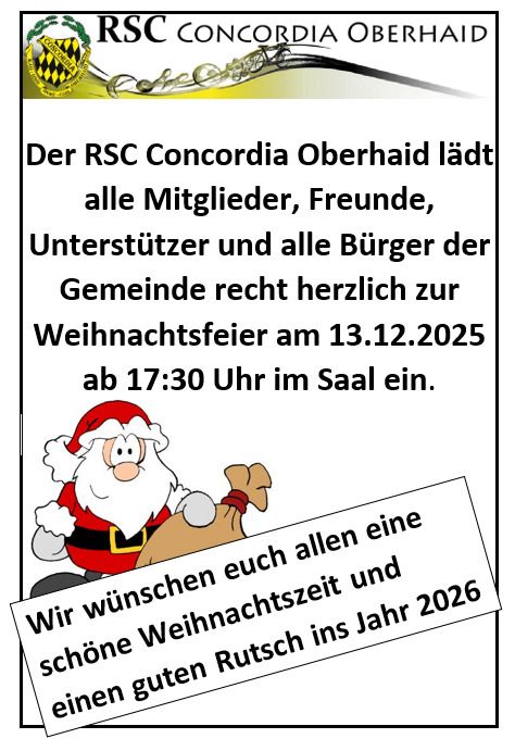Der RSC Concordia Oberhaid begrüßt Sie recht herzlich auf der offiziellen Homepage, insbesondere für den Bereich Fußball und Kegeln. Der RSC Concordia Oberhaid ist der mitgliedsstärkste Verein in der Gemeinde Oberhaid. Kindern, Jugendlichen und Erwachsenen wird in den Abteilungen Fußball, Basketball, Radfahren, Kegeln und im Theater eine Menge geboten. Das Vereinsheim besteht aus einem großen Wirtschaftsraum mit Beamer und Leinwand, sowie Küche, Kühlraum und Toiletten. Außerdem eine vierbahnige Kegelbahn mit zwei Umkleiden. Zusätzlich zählen die modernisierten Fußballumkleiden und Duschen zum Gebäudekomplex. Vor dem Vereinsheim befinden sich ausreichend Parkplätze, eine Grillbude und drei sehr gut gepflegte Sportplätze (zwei davon mit Flutlichtanlagen).